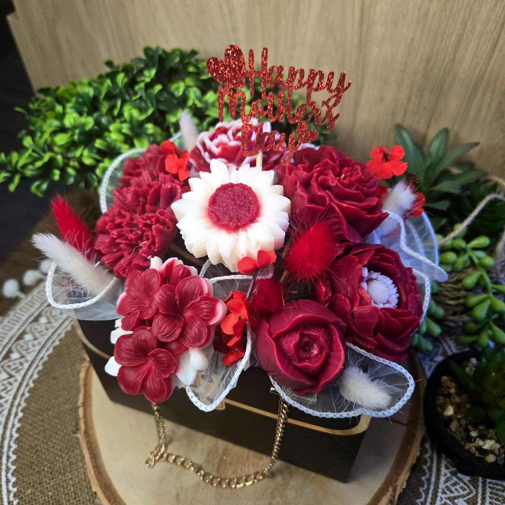 Ce bouquet original est entièrement composé de fondants en cire végétale, moulés à la main dans des formes florales délicates.